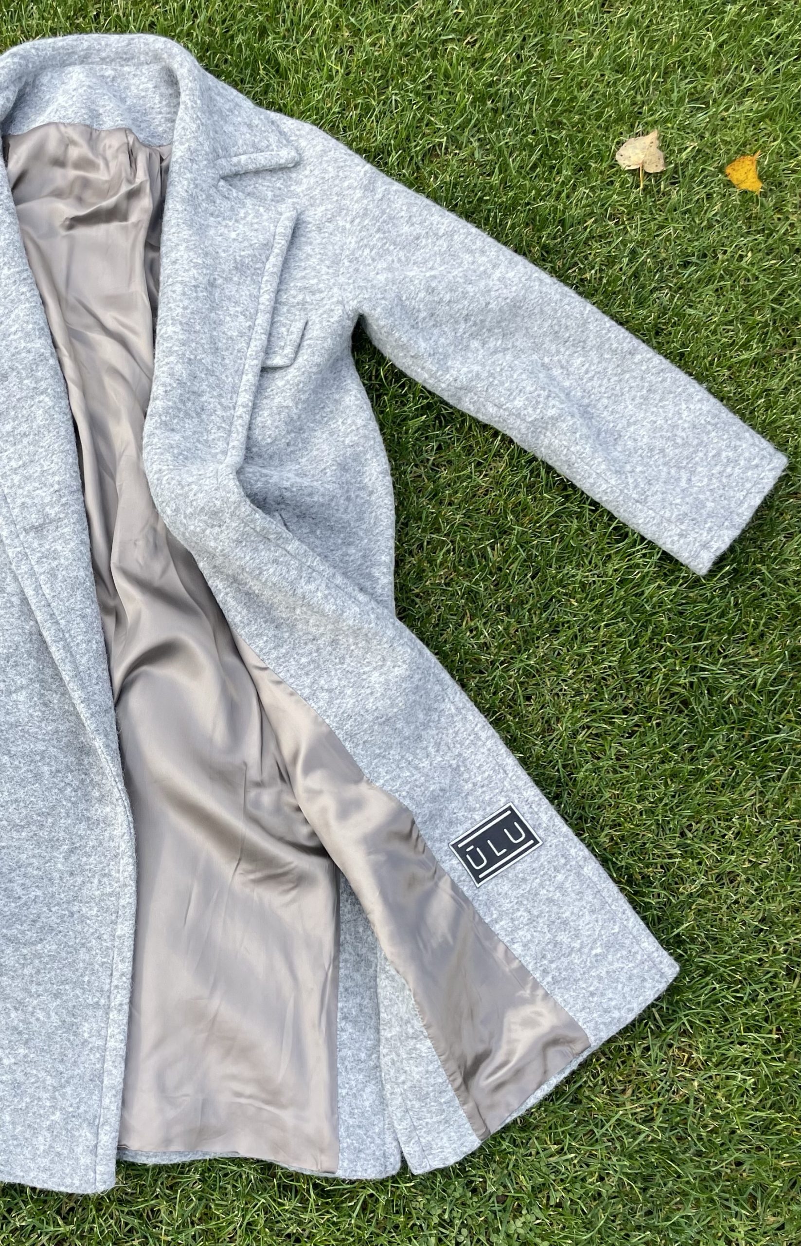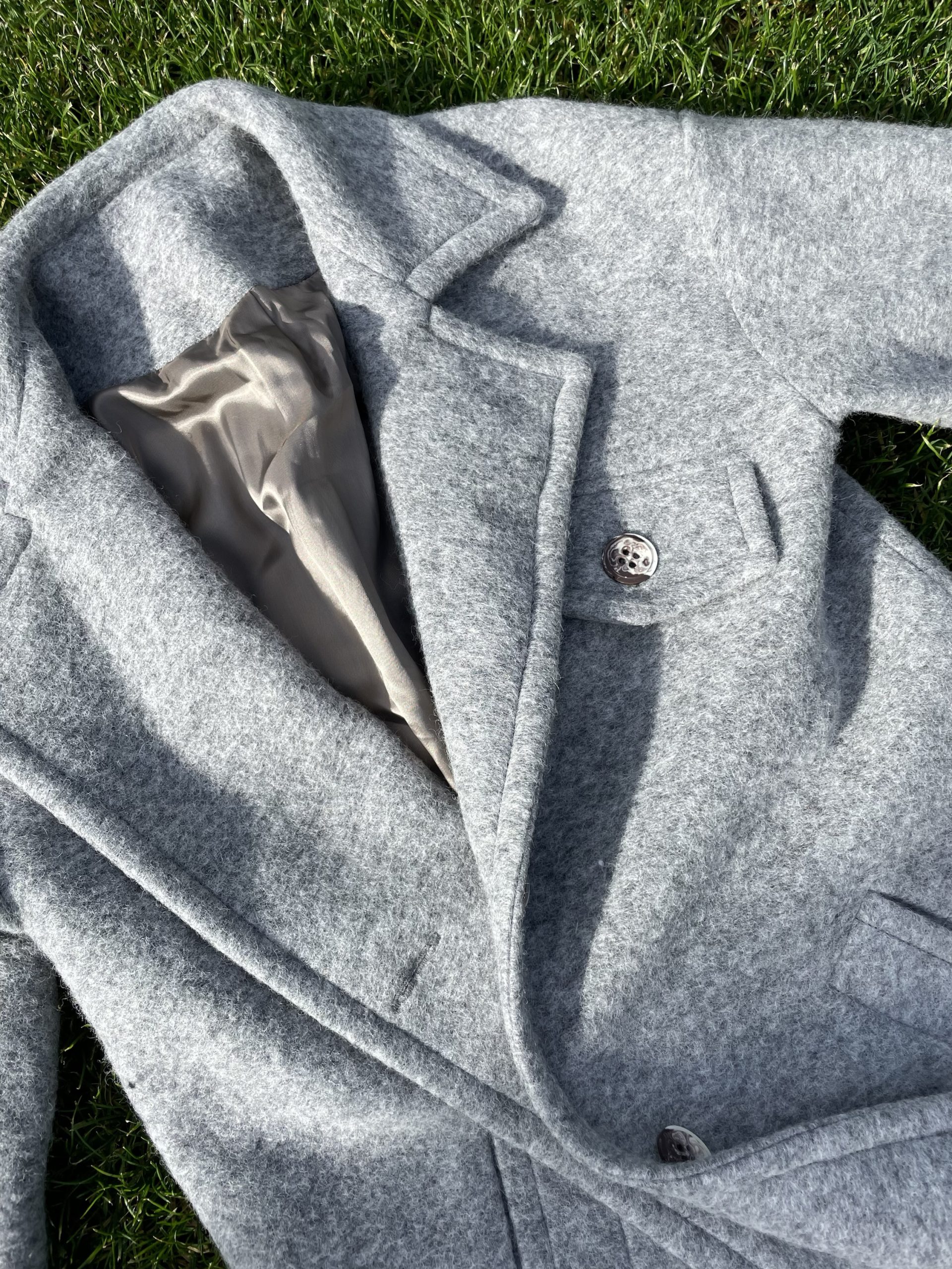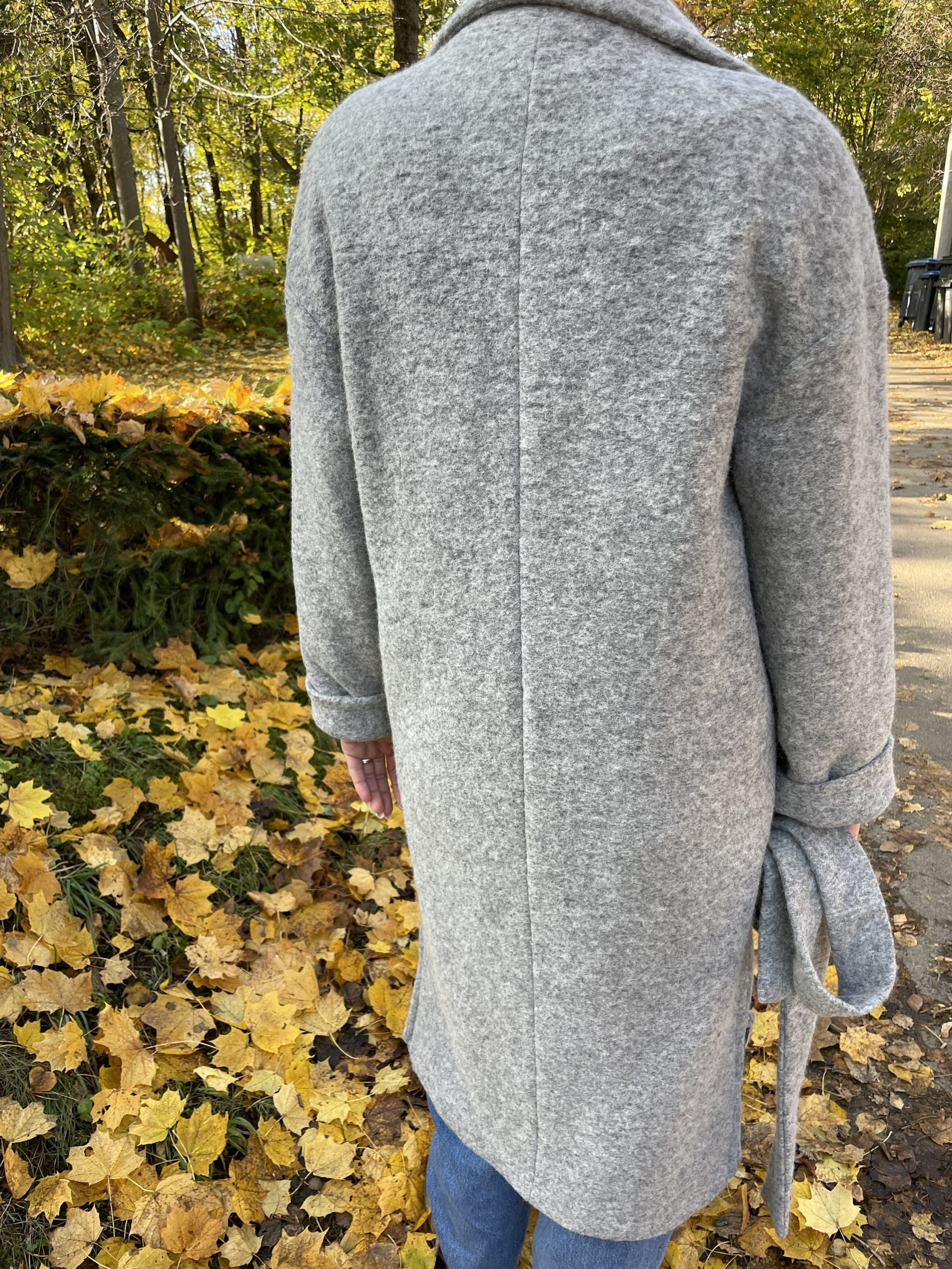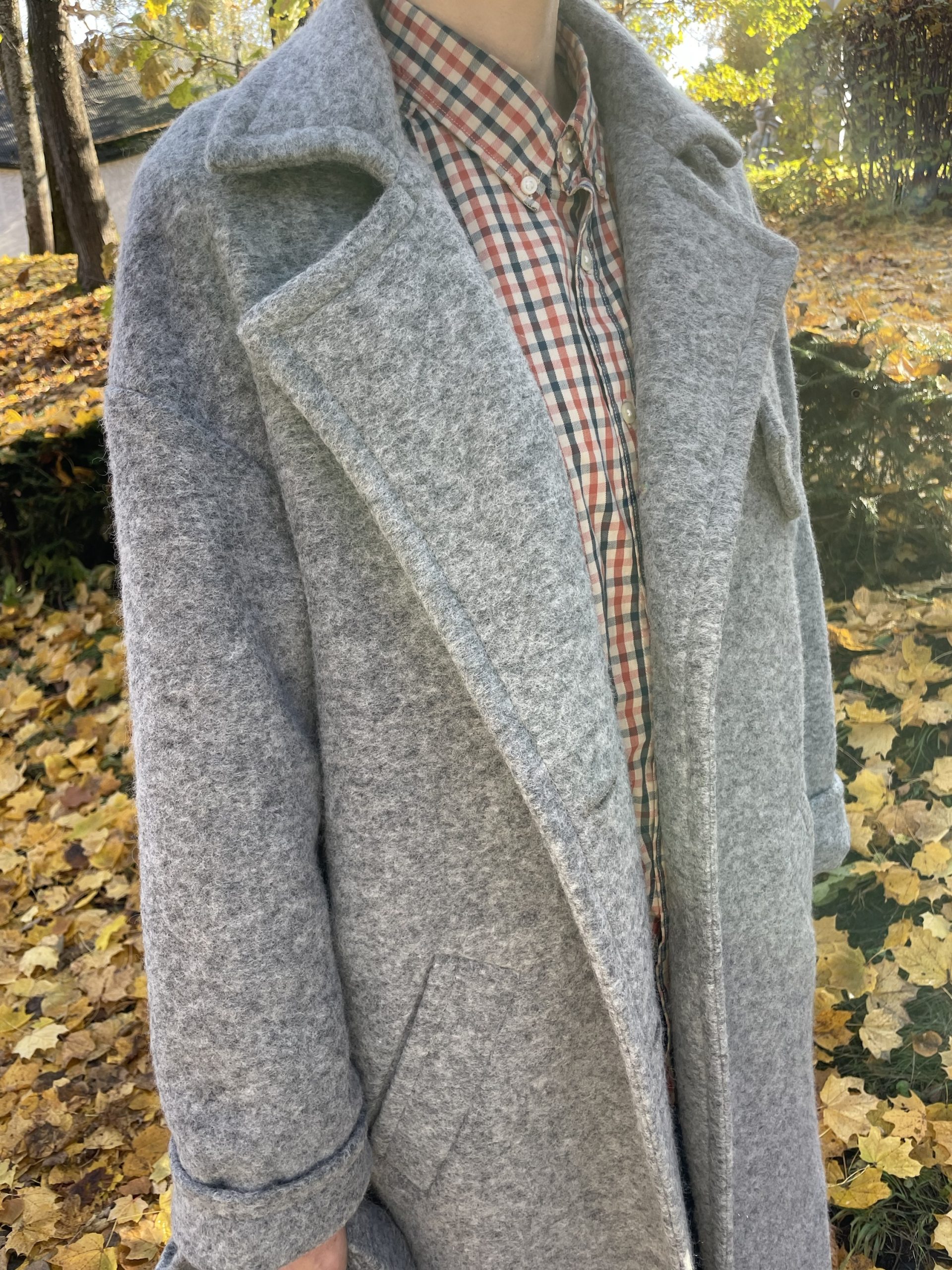 Ilgas vilnos paltas pilkos spalvos su viskozės pamušalu. “Oversize” stiliaus, minkšto tekstūrinio audinio, puikiai dera tiek prie suknelės tiek prie laisvesnio stiliaus drabužių. Palto rankogaliai apsiūti taip, kad galima būtu užlenkti norint trumpesnių rankovių, didelės kišenės sutalpins pirštines, telefoną ar panašaus dydžio daiktus, yra papildoma kišenė su saga palto viršutinėje dalyje. Paltas susisega dviem sagom bei turi tokios pat medžiagos diržą, palto šonuose yra skeltukai, kurie susisega sagom.