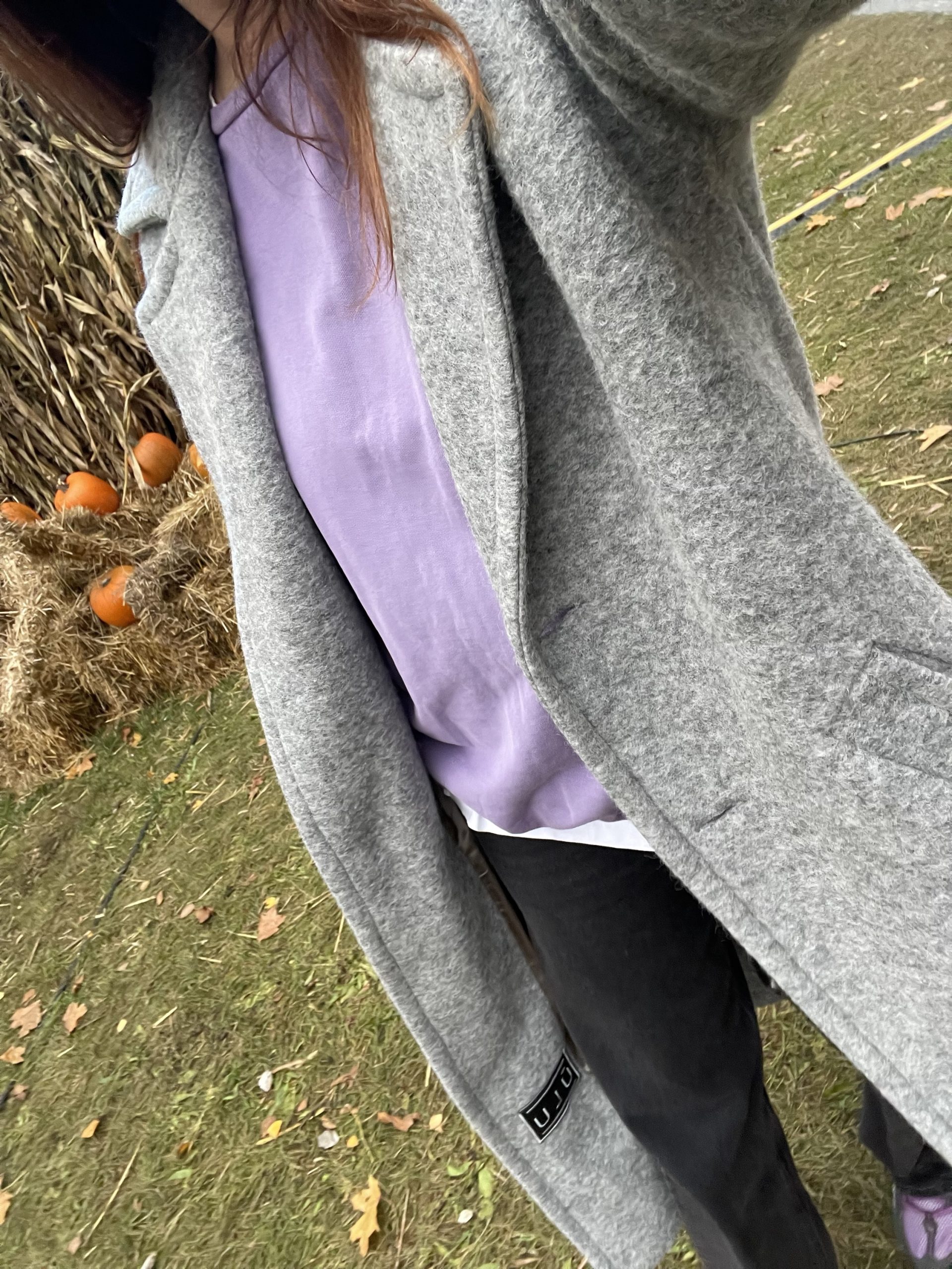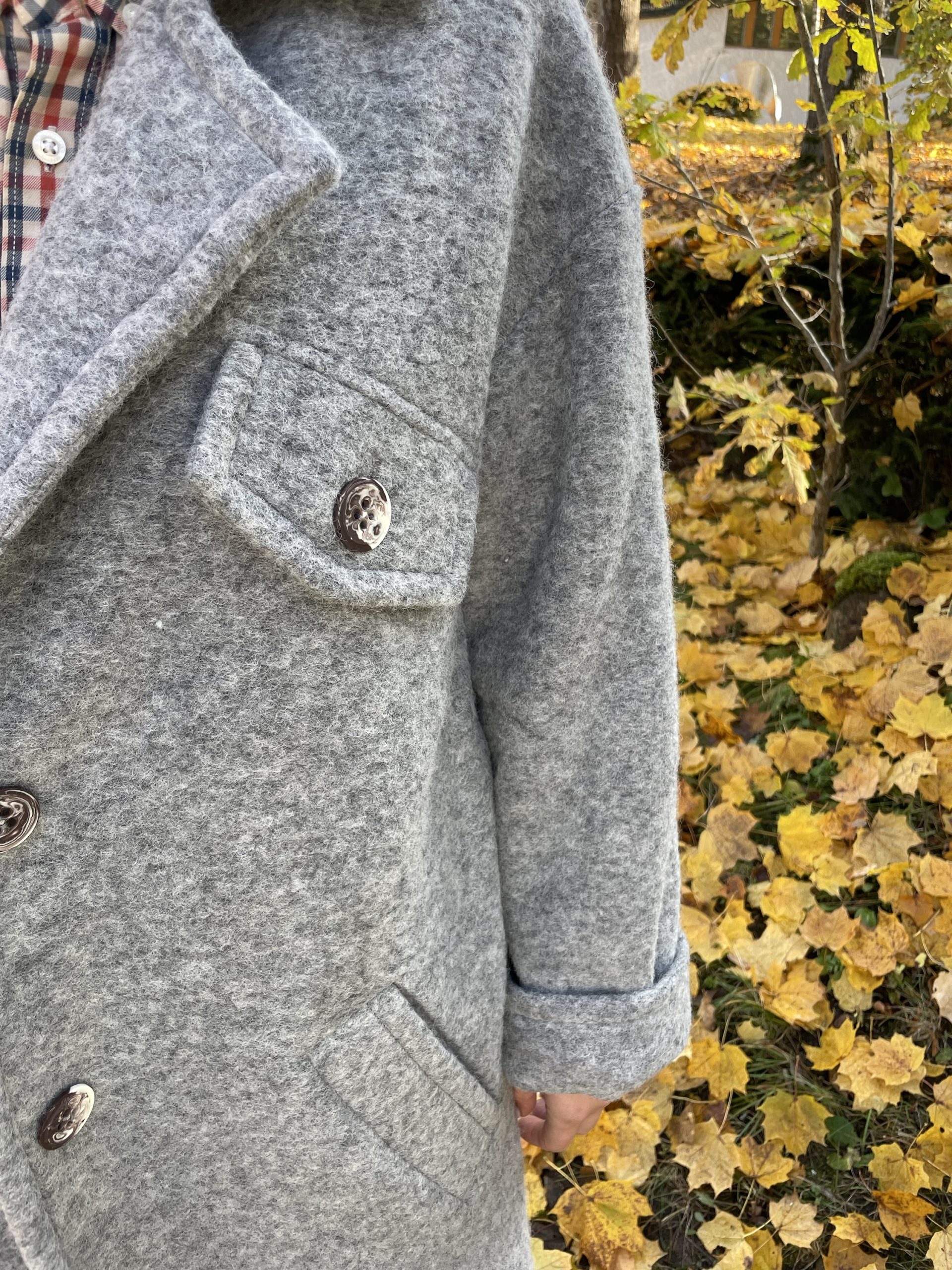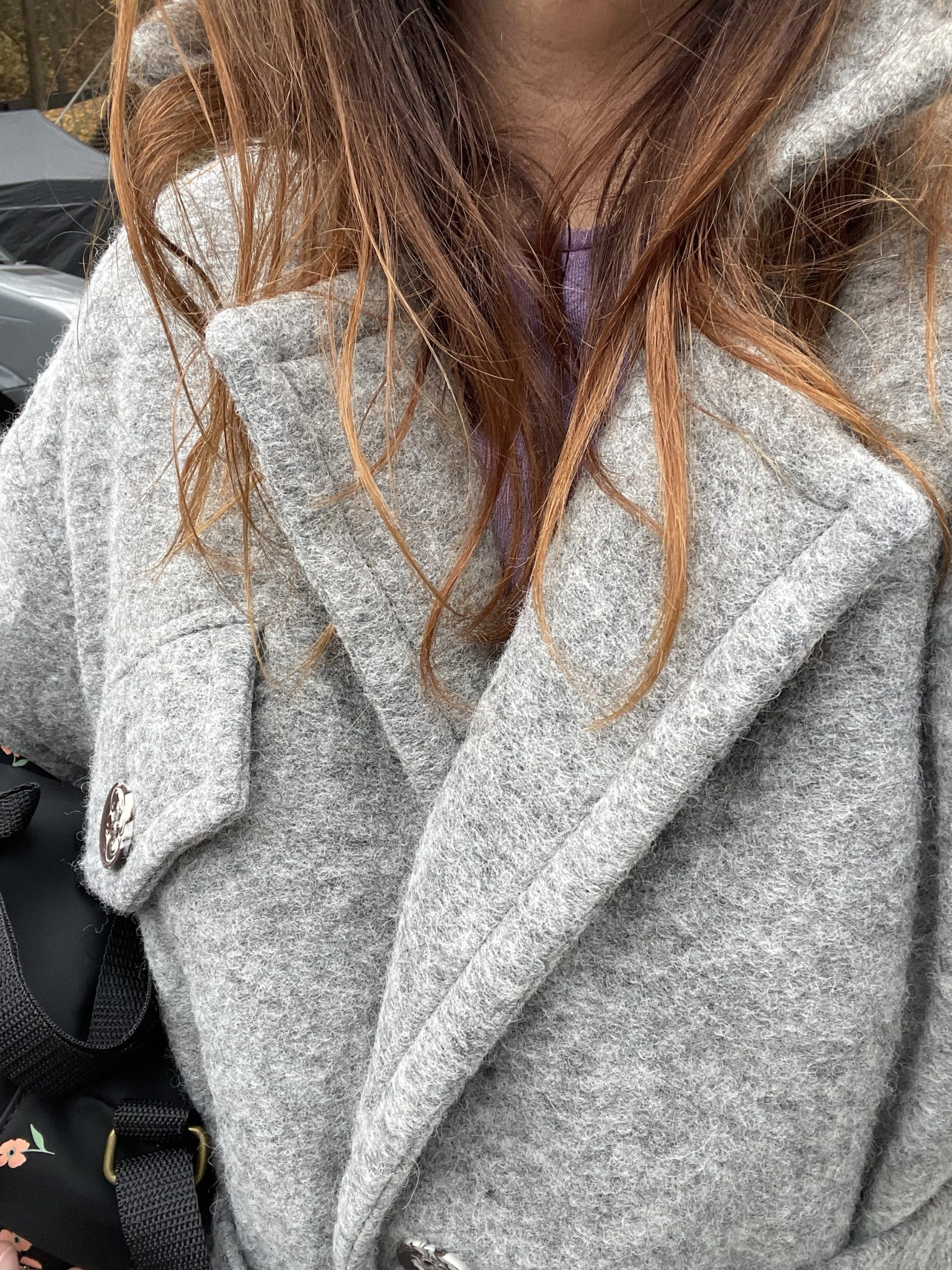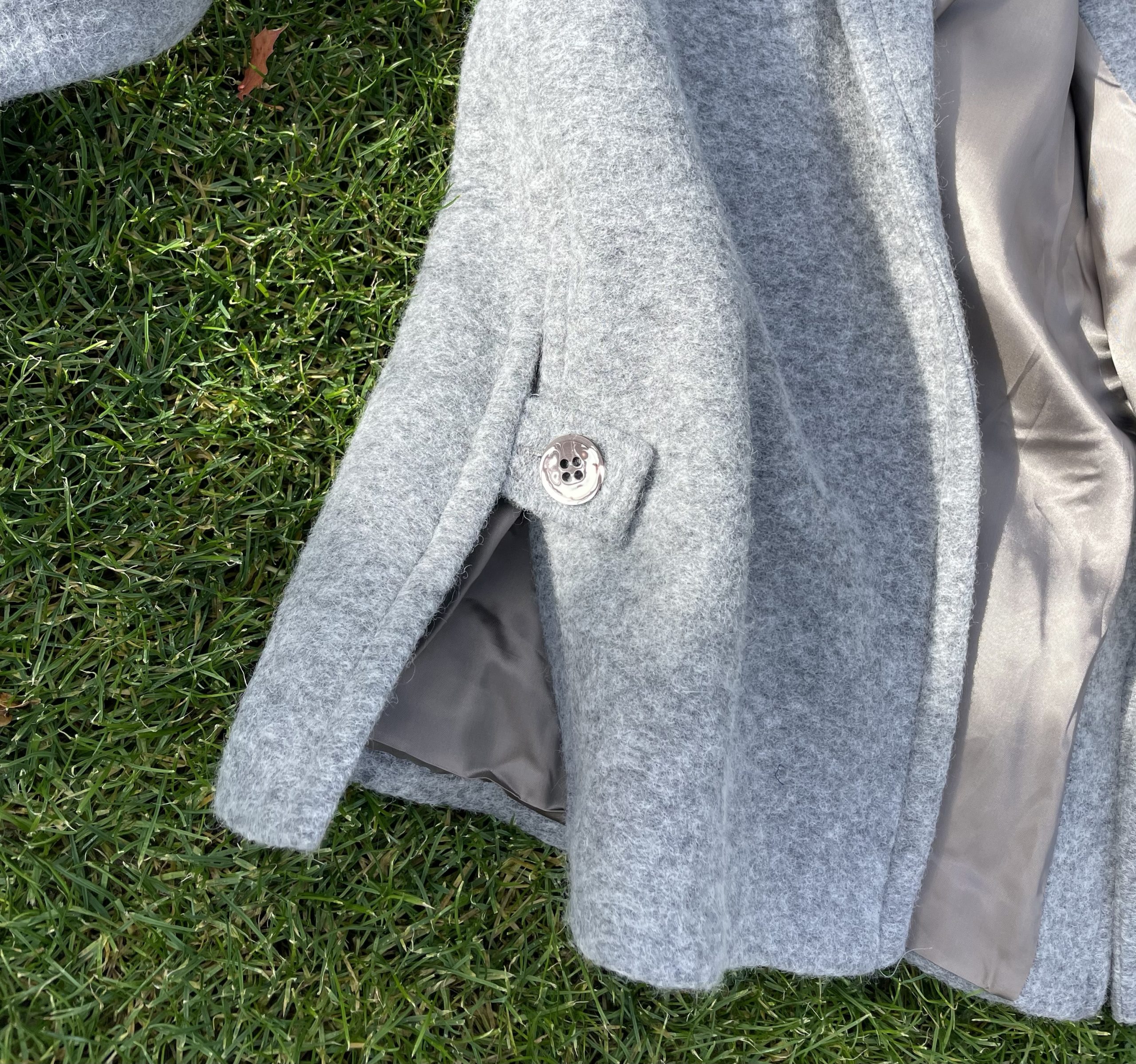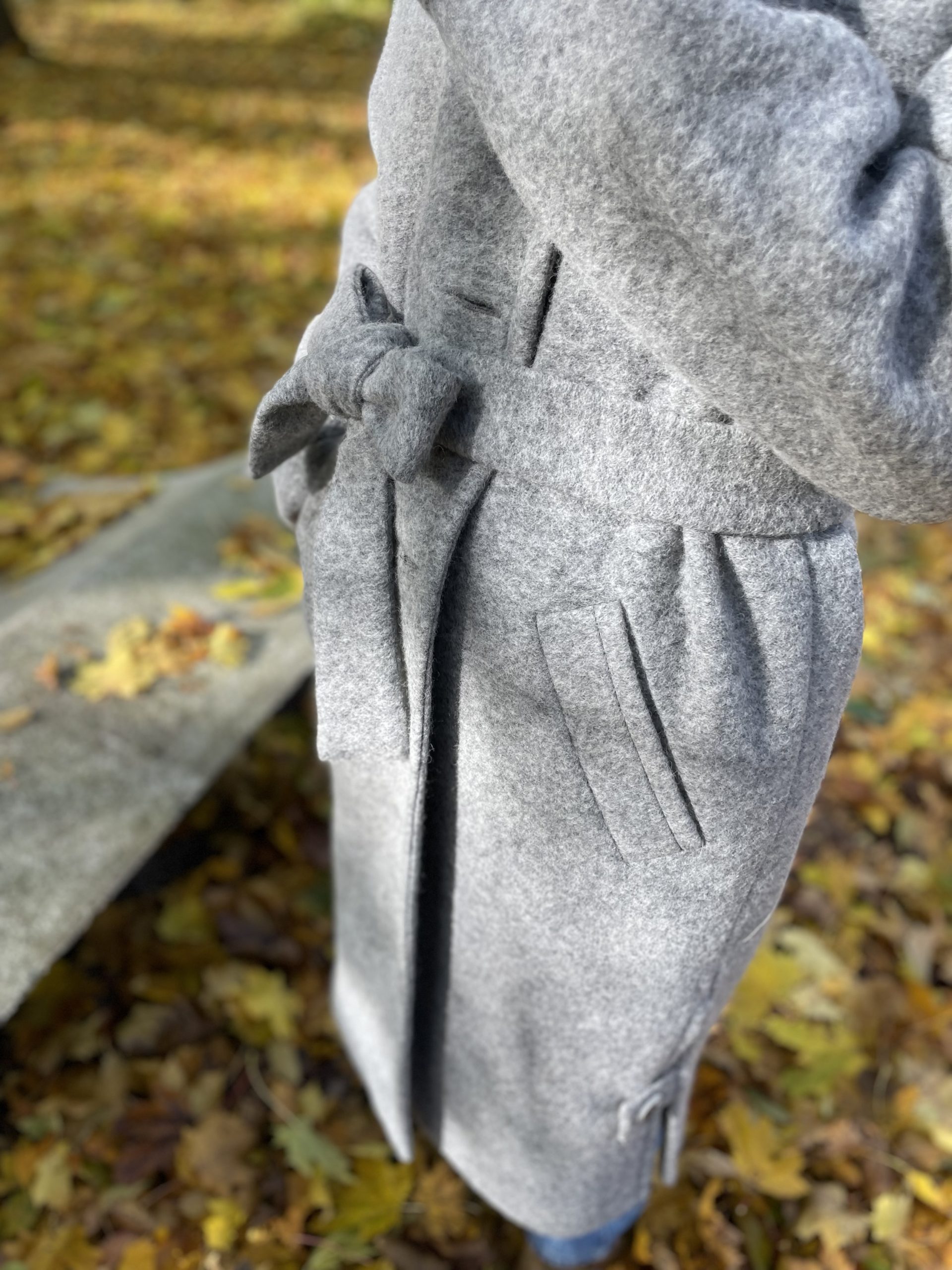Ilgas vilnos paltas pilkos spalvos su viskozės pamušalu. “Oversize” stiliaus, minkšto tekstūrinio audinio, puikiai dera tiek prie suknelės tiek prie laisvesnio stiliaus drabužių. Palto rankogaliai apsiūti taip, kad galima būtu užlenkti norint trumpesnių rankovių, didelės kišenės sutalpins pirštines, telefoną ar panašaus dydžio daiktus, yra papildoma kišenė su saga palto viršutinėje dalyje. Paltas susisega dviem sagom bei turi tokios pat medžiagos diržą, palto šonuose yra skeltukai, kurie susisega sagom.