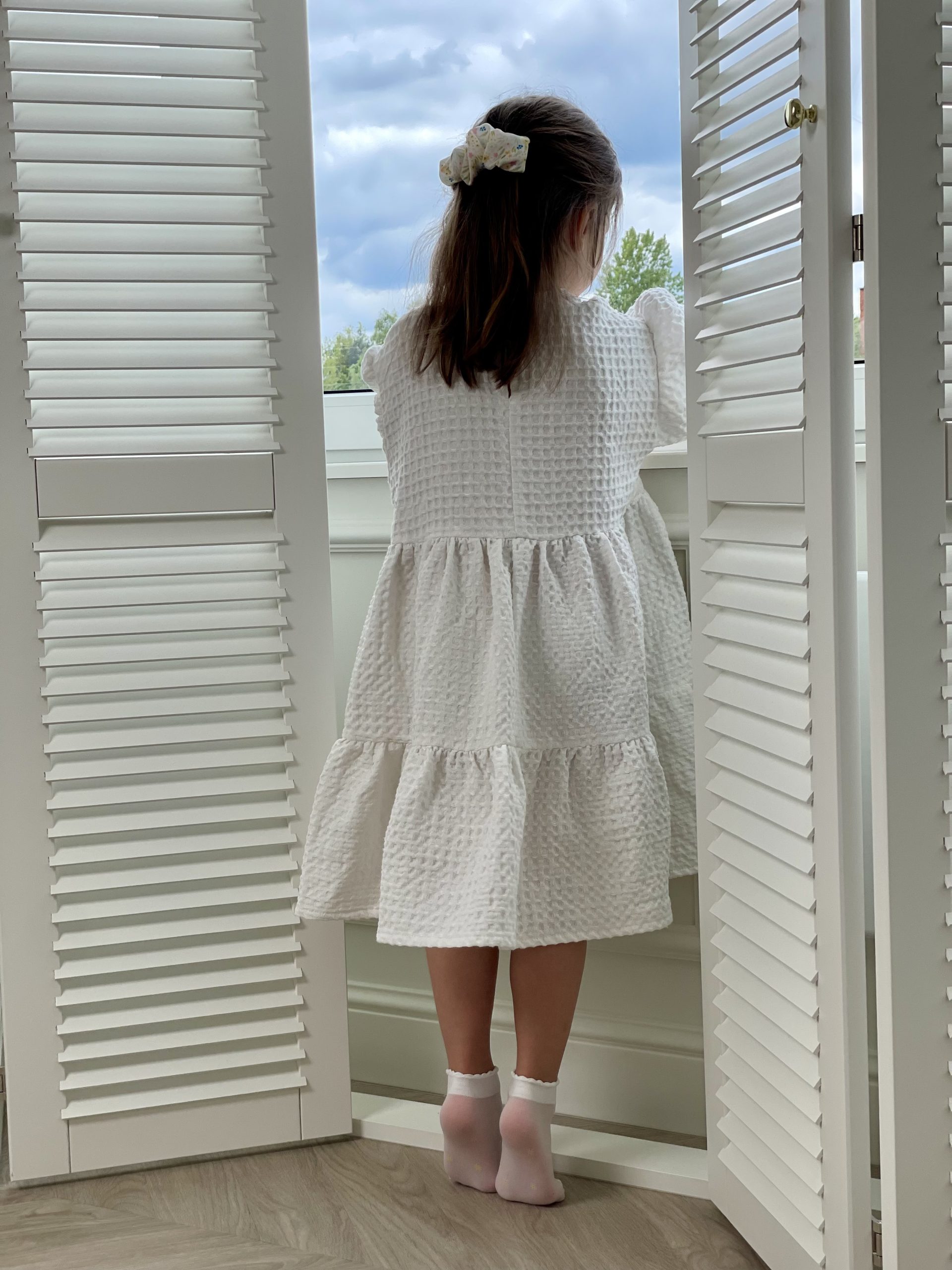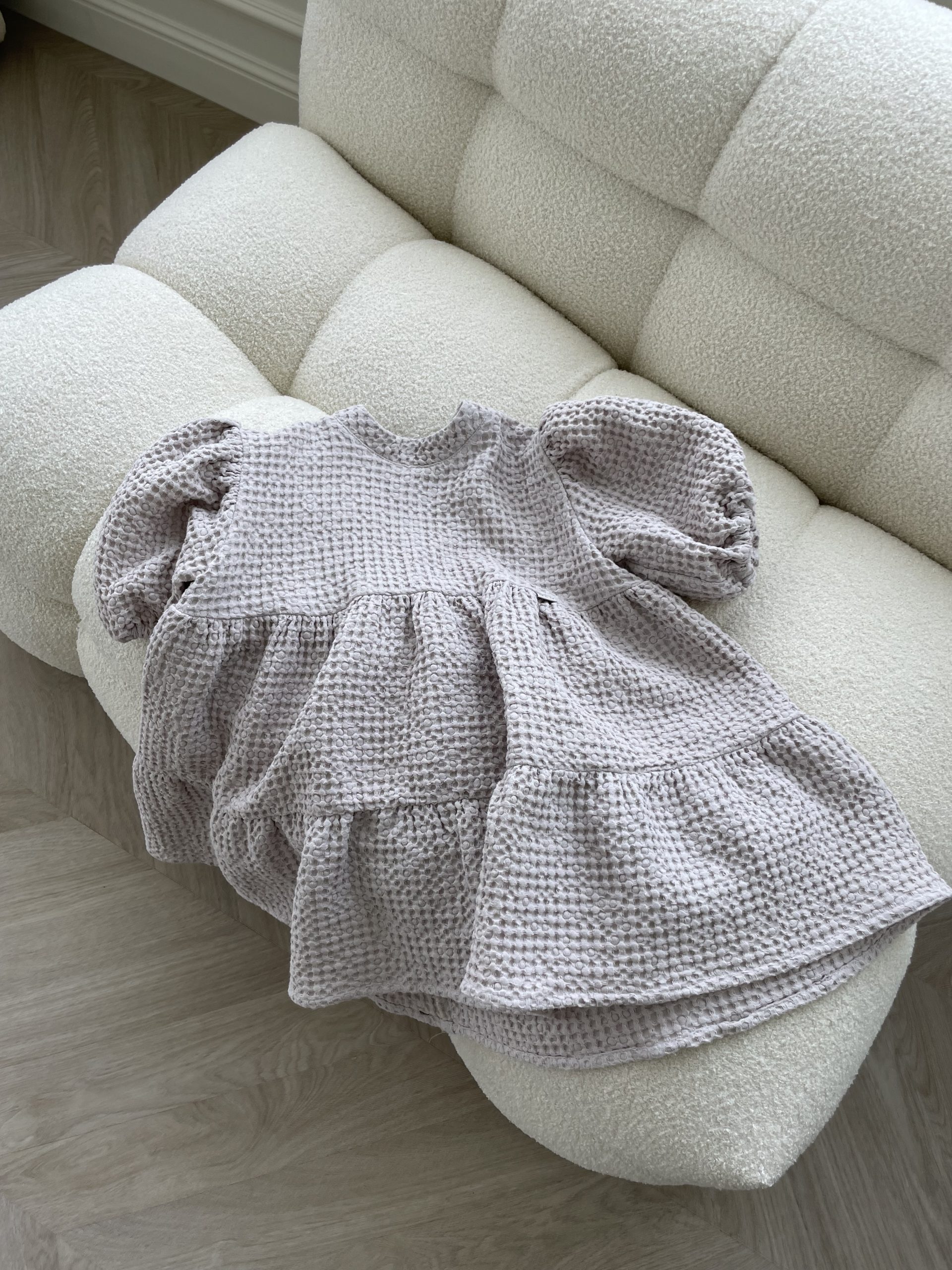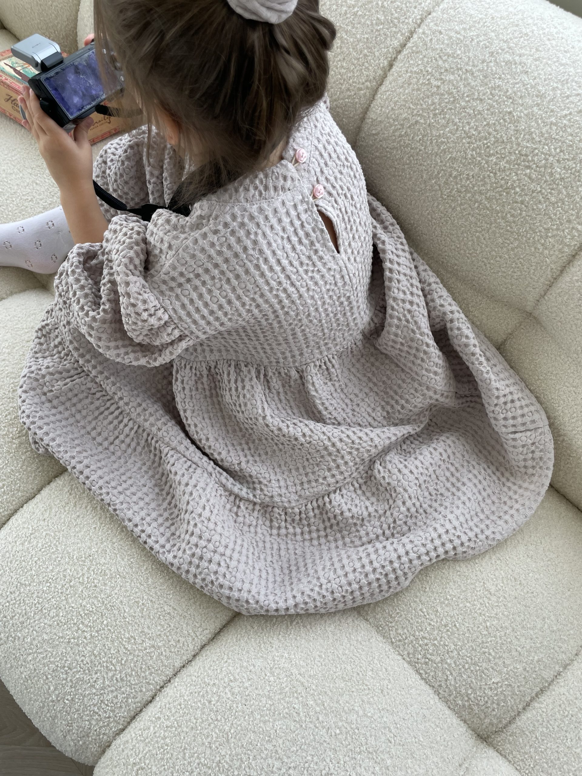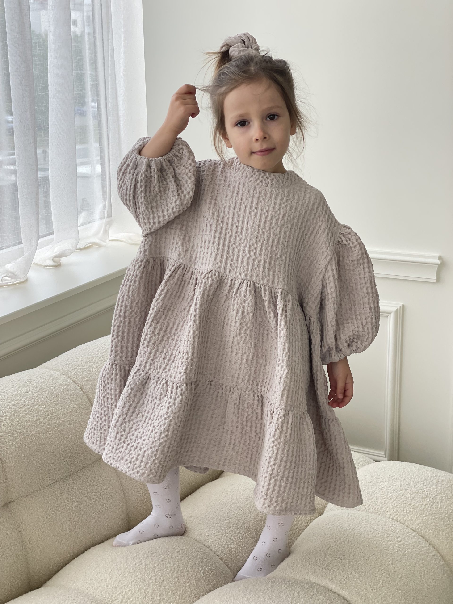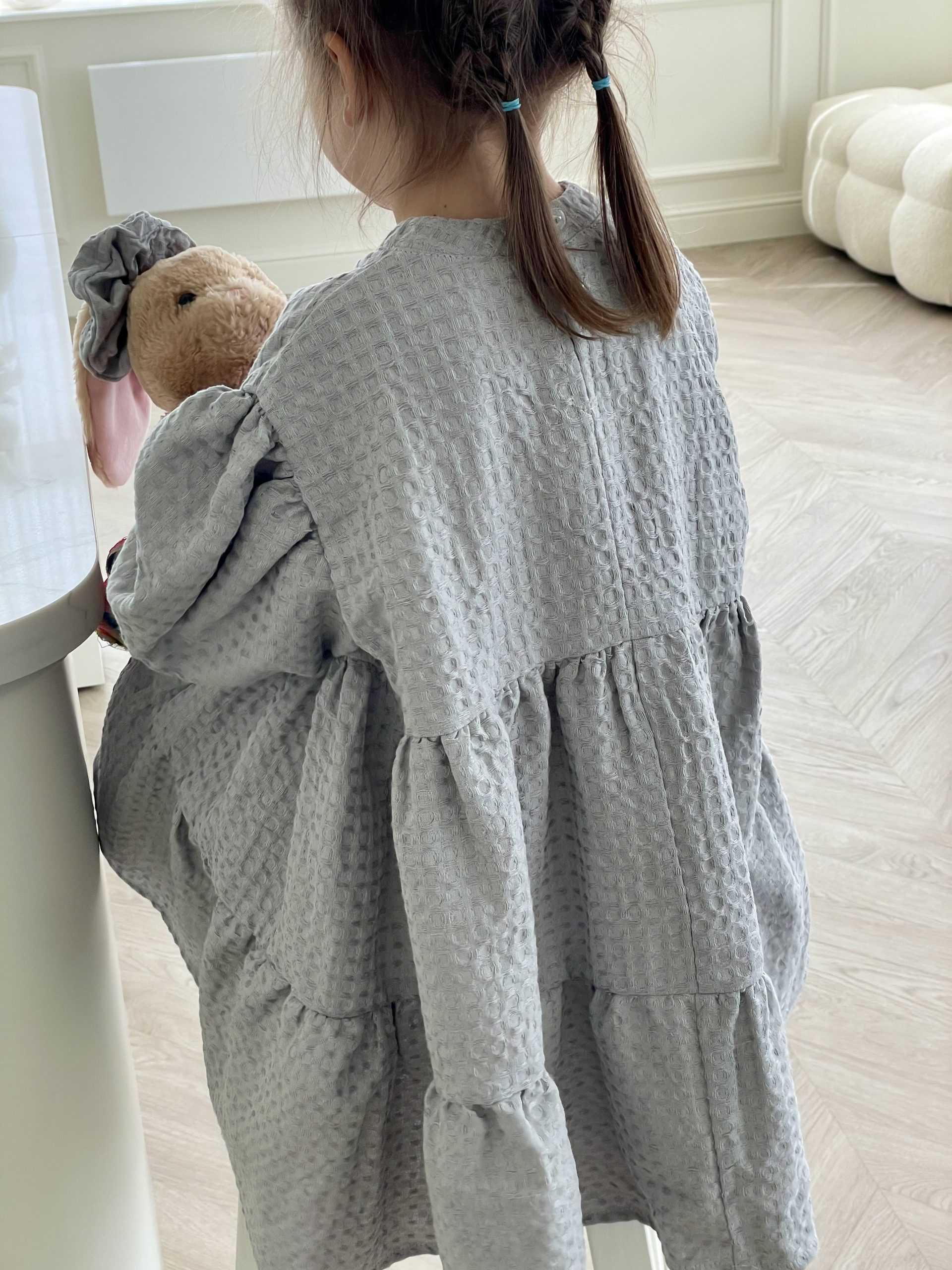 Suknelė mergaitėm ŪLA sukurta iš asmeninių patirčių. Mergaitės, kurios mėgsta sukneles, nenori būti juose suvaržytos, todėl mūsų suknelės yra plačios ir kaip mergaitės sako labai linksmos ir patogios. Būtent vaflinis audinys suteikia suknelei sunkumo, tad papūtus vėjui suknelė „neišskris”, o aktyviai judant netrukdys. Nors suknelės audinys sunkesnis, tačiau jis yra natūralaus lino ir medvilnės mišinys, mergaičių kūneliai kvėpuos šiltą vasaros dieną ir šildys vėsesniais metų laikais. Taip, ją galėsite dėvėti visais metų laikais! O kadangi suknelė yra labai plati, jos užteks keliems metams, ji tiesiog patrumpės, bet niekur neverž, bent jau Ūla savo mylimiausias sukneles dėvi jau kelis metus ir dar nežada atsisveikint, nes sakė, kai labai sutrumpės nešios su kelnėm, kaip ilgas palaidines 😀 (uoj tie vaikai!)