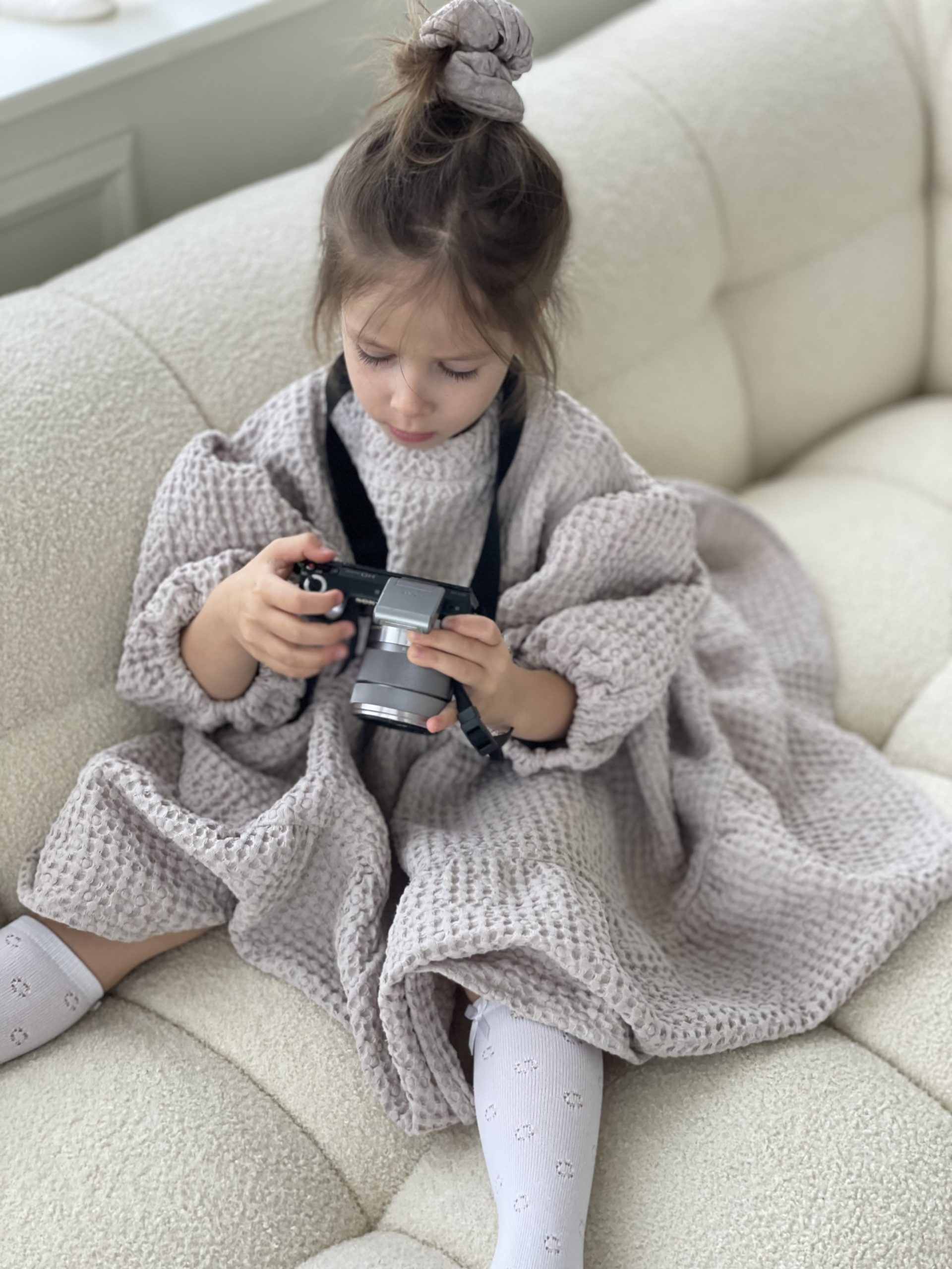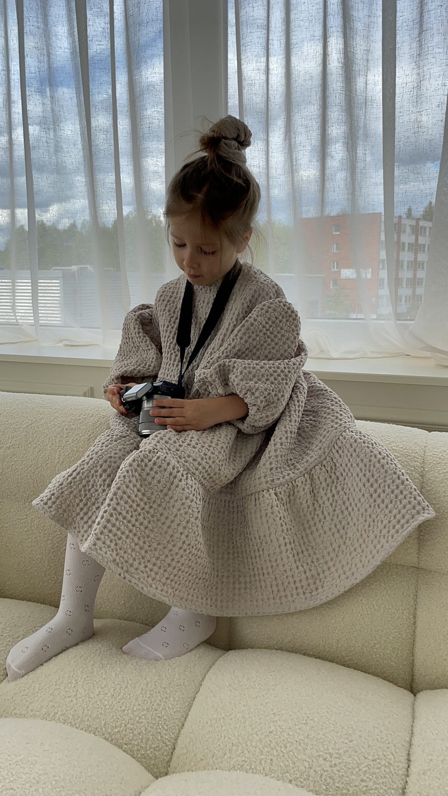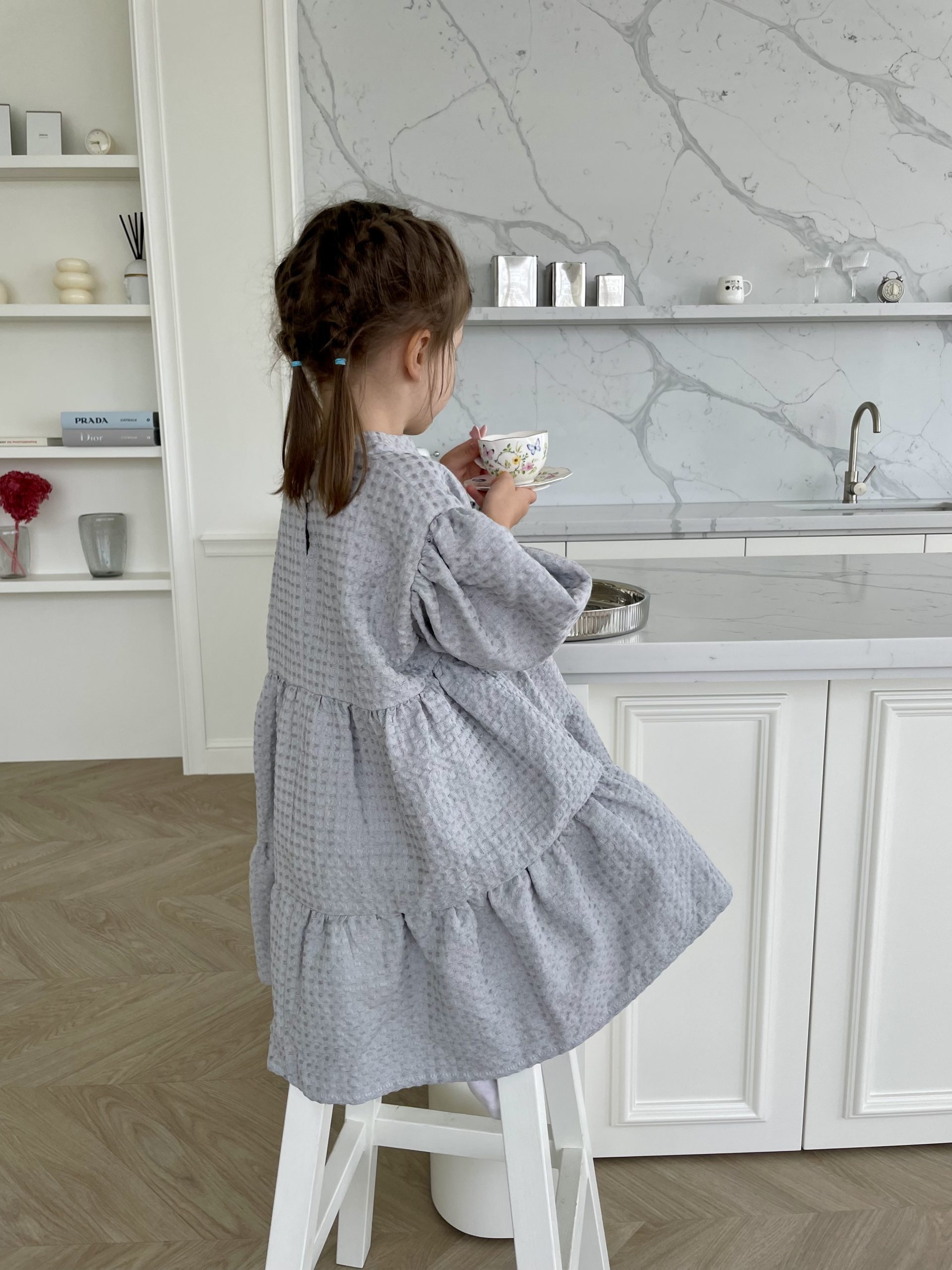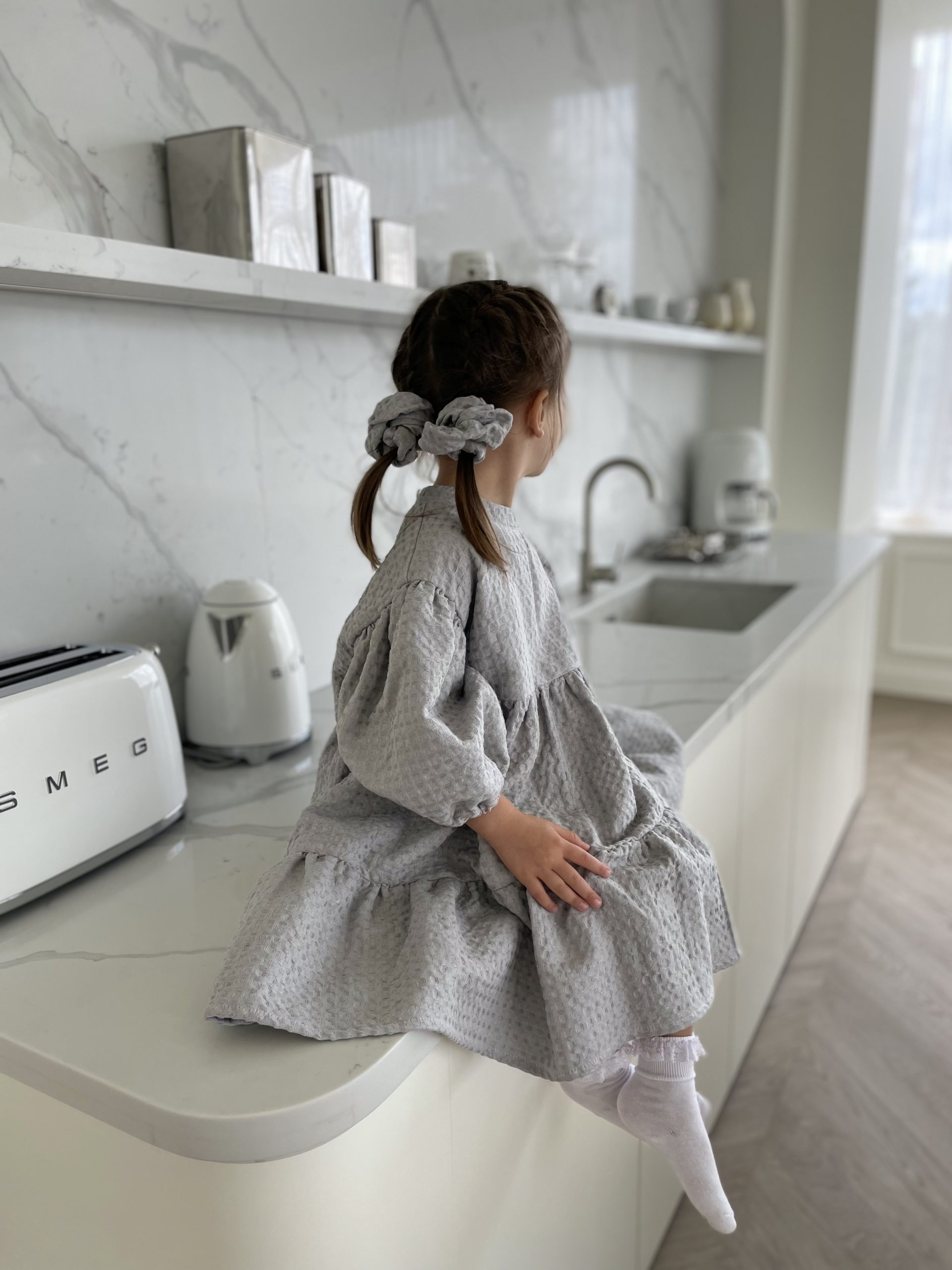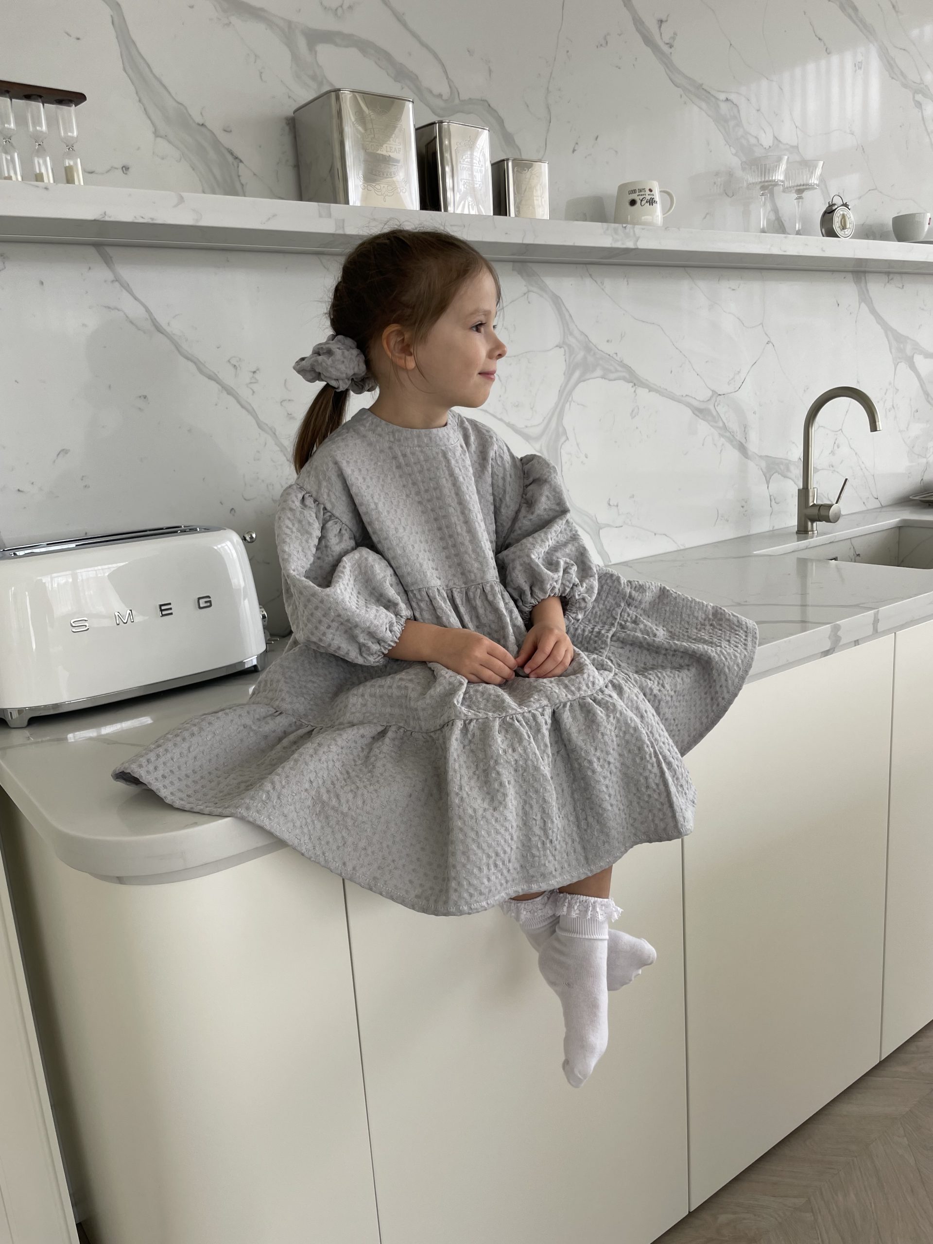 Suknelė mergaitėm ŪLA sukurta iš asmeninių patirčių. Mergaitės, kurios mėgsta sukneles, nenori būti juose suvaržytos, todėl mūsų suknelės yra plačios ir kaip mergaitės sako labai linksmos ir patogios. Būtent vaflinis audinys suteikia suknelei sunkumo, tad papūtus vėjui suknelė „neišskris”, o aktyviai judant netrukdys. Nors suknelės audinys sunkesnis, tačiau jis yra natūralaus lino ir medvilnės mišinys, mergaičių kūneliai kvėpuos šiltą vasaros dieną ir šildys vėsesniais metų laikais. Taip, ją galėsite dėvėti visais metų laikais! O kadangi suknelė yra labai plati, jos užteks keliems metams, ji tiesiog patrumpės, bet niekur neverž, bent jau Ūla savo mylimiausias sukneles dėvi jau kelis metus ir dar nežada atsisveikint, nes sakė, kai labai sutrumpės nešios su kelnėm, kaip ilgas palaidines 😀 (uoj tie vaikai!)